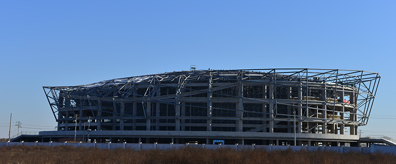 工程主體結(jié)構(gòu)形成為框架混凝土結(jié)構(gòu),主體一層,局部四層,主體砼柱分為兩圈,外圈砼柱共32根,柱頂標(biāo)高16.13至21.9米。內(nèi)圈不連續(xù)混凝土柱共26根(北側(cè)場(chǎng)館入口處抽空6根混凝土柱),柱頂標(biāo)高為20.14至21.9米。