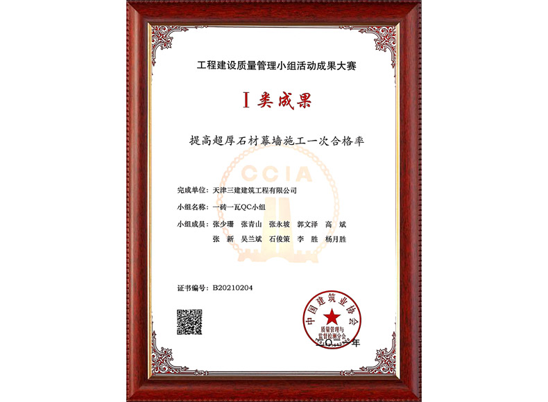 2021中建協I類 提高超厚石材幕墻施工一次合格率