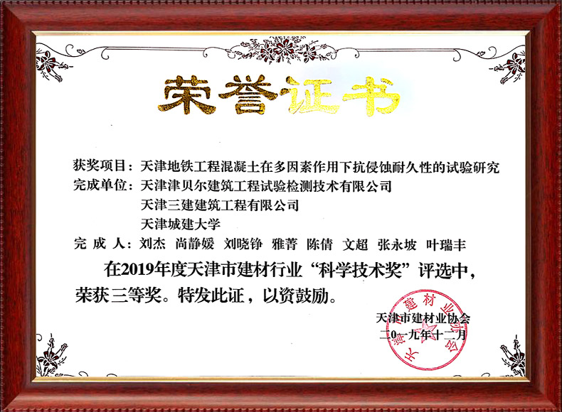 2020天津市建材行業“科學技術獎”三等獎